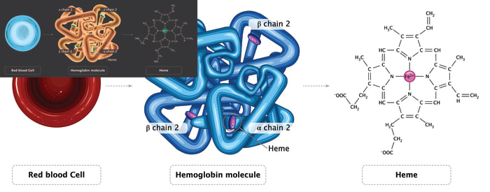 Neste átomo de ferro pode ser ligada uma molécula de oxigénio, de tal forma que pode ser facilmente liberada em áreas com falta de oxigênio. Hoje sabe-se que é necessária a estrutura da hemoglobina de quatro cadeias proteicas para um fornecimento de oxigénio suficiente para as células do corpo, embora o oxigénio interaja somente com o ferro do heme. Vamos considerar com mais atenção este fato surpreendente.